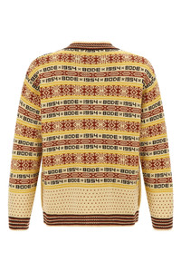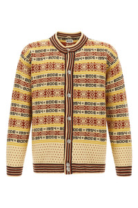 cod. MRF25KT006MULTI 'Marzipan' jacquard patterned wool cardigan, crew neck, front metal logo button closure, pockets, long cuffed sleeves and dropped shoulders. Color: Multicolor Size & Fit: true to size fit Composition: 100% wool Made in: Romania