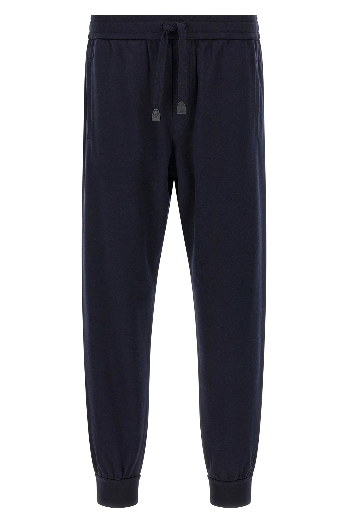 cod. UJSF0LOD6054100 Joggers in light cotton and cashmere blend jersey, adjustable drawstring elastic waistband, trompe l'oeil flap, pockets, straight leg, ankle cuffs. Color: Blue Size & Fit: true to size fit Composition: 85% cotton, 15% cachemire Made in: Italy