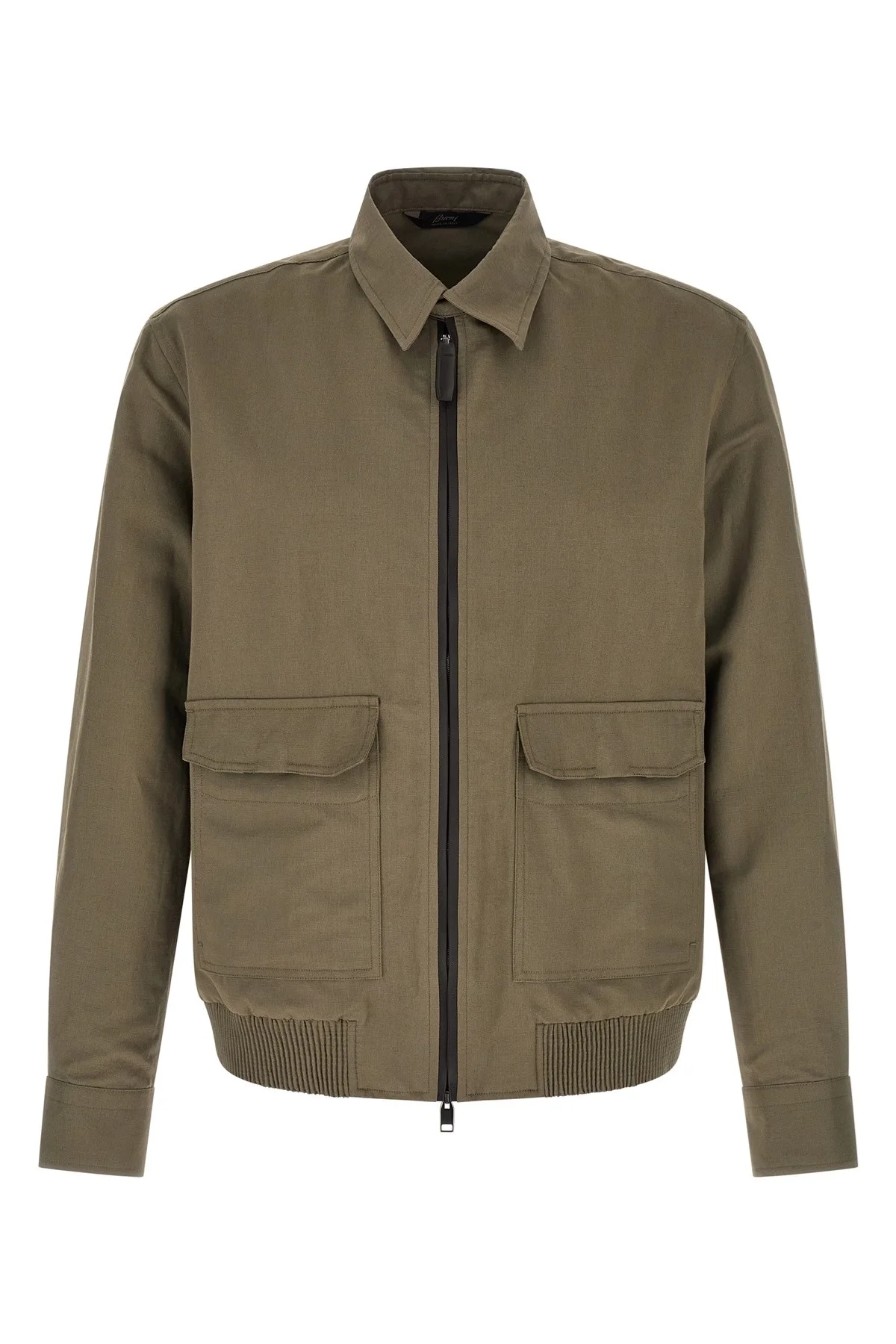 cod. SLWF0LPA1063200 Linen and cotton blend blouson, unlined, shirt collar, front zip closure with contrasting leather detail, pockets, long cuffed sleeves, elastic hem, leather patch with embossed logo on the back. Color: Green Size & Fit: true to size fit Composition: 53% linen, 47% cotton Made in: Italy
