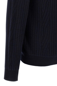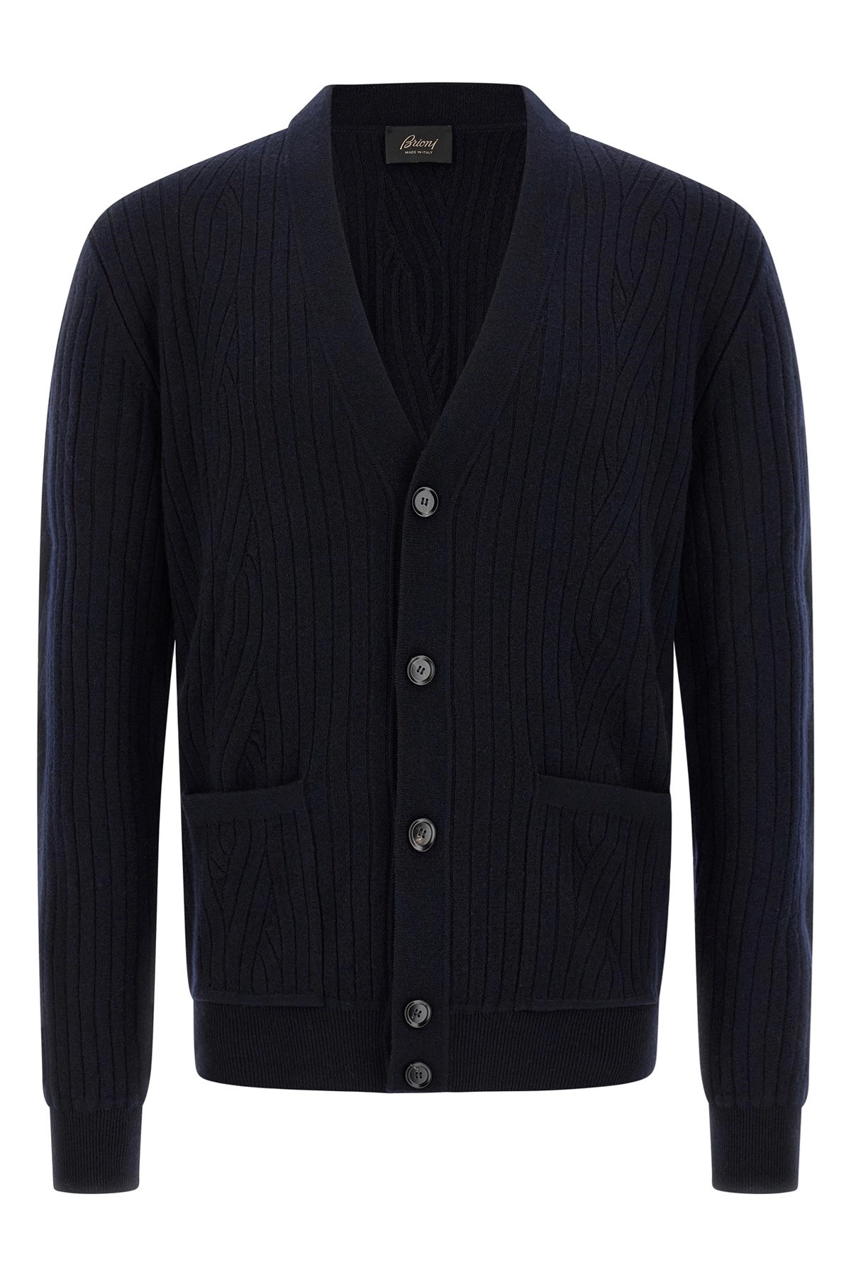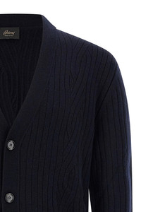 cod. UMS40LODK074000 Ribbed and braid wool and cashmere blend cardigan, V-neck, front button closure, pockets, long cuffed sleeves. Color: Blue Size & Fit: true to size fit Composition: 80% wool 20% cashmere Made in: Italy
