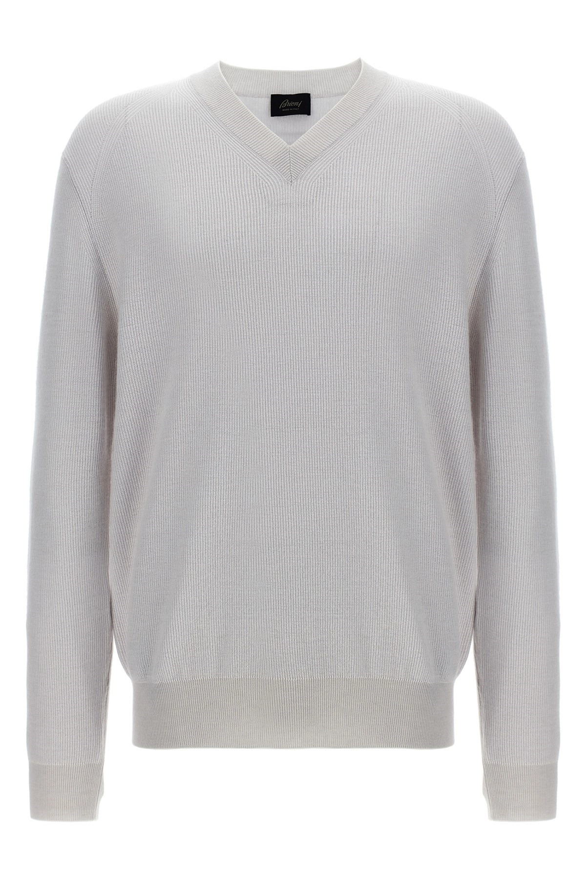 cod. UMQ70LOCK129190 Ribbed cashmere and wool sweater with V-neck, long cuffed sleeves. Color: White Size & Fit: true to size fit Composition: 64% cashmere 36% wool Made in: Italy