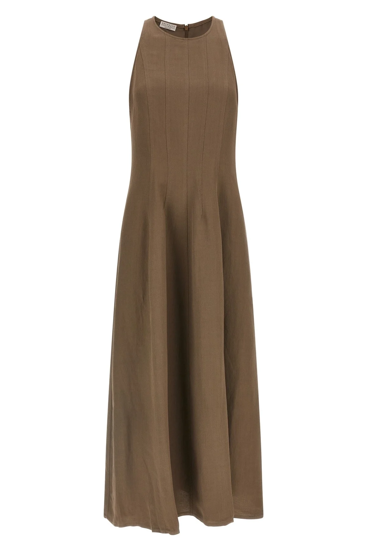 cod. MH126A5171C2925 Sleeveless dress in viscose and linen blend with A-line silhouette, crew neck, back zip closure, petticoat. Color: Brown Size & Fit: true to size fit Composition: 72% viscose, 28% linen Made in: Italy