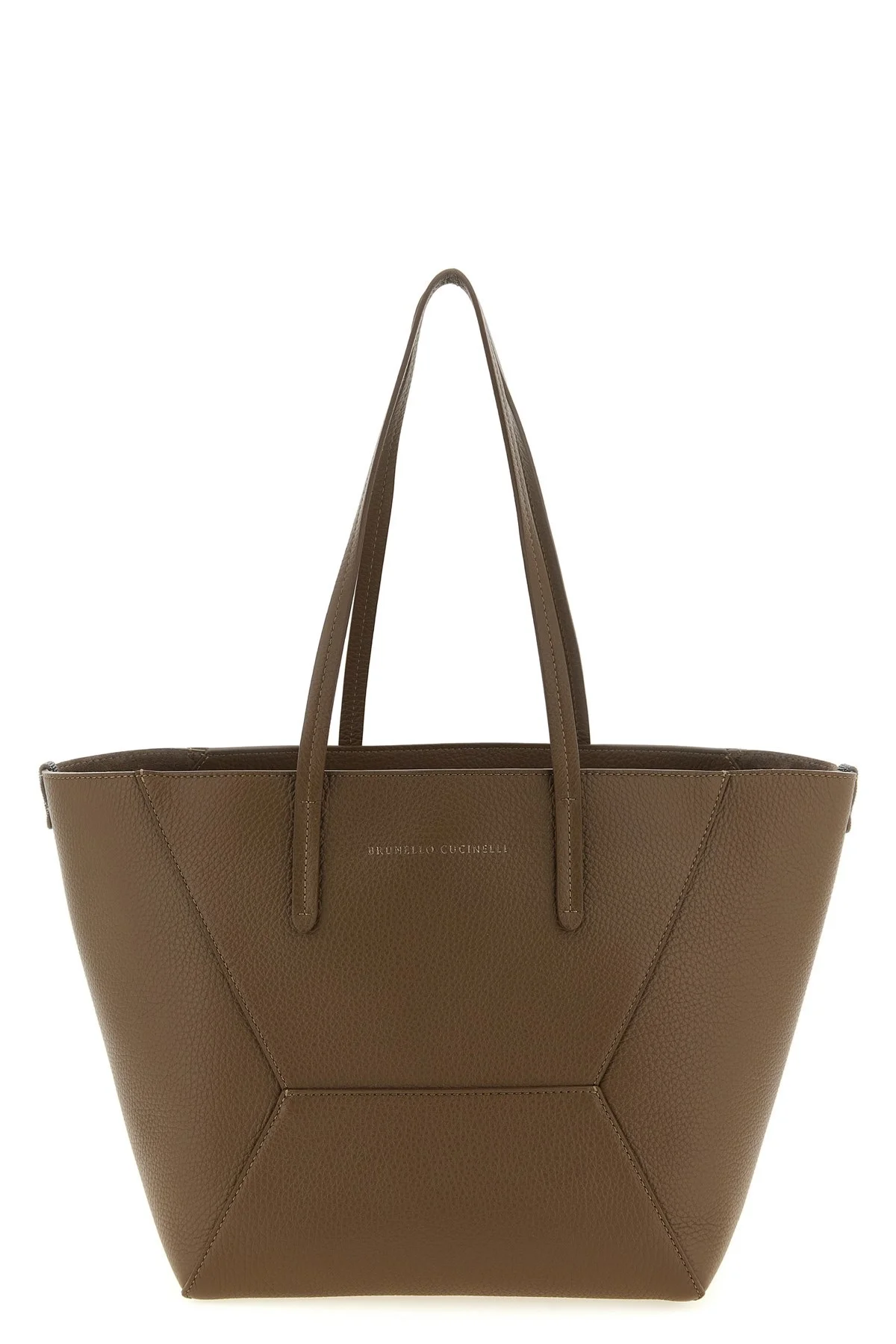 cod. MBDKD2573C9357 'BC Duo' shoulder bag in hammered calf leather, panel construction, double fixed handle, front embossed logo, top zip closure, side Monile details with internal snap hook to change capacity, removable clutch. Color: Brown Size & Fit: W 25 (bag base) x H 26 x D 18.5 cm Composition: 100% Scottish Red Deer (cervus elaphus) Made in: Italy