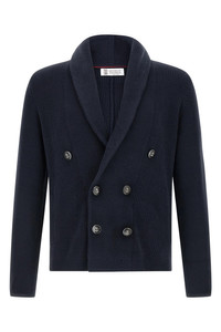 cod. M2873346C2425 English half-ribbed cotton knit cardigan with metal buttons, double-breasted model, regular fit shoulder height and comfortable back, shawl neck, vertical pockets, long sleeves. Color: Blue Size & Fit: True to size fit Composition: 100% cotton Made in: Italy