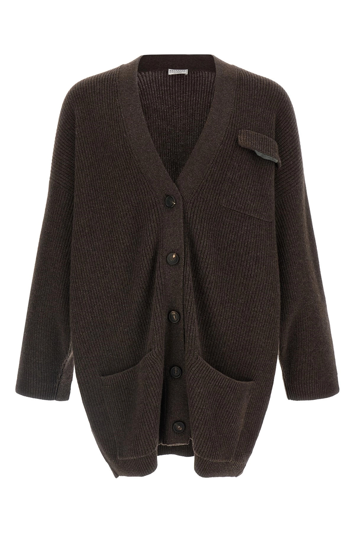 cod. M12721716C2559 Knitted cashmere maxi cardigan, V-neck, front button closure, pocket with Monile detail, pockets, long sleeves with cuffs and dropped shoulder. Color: Brown Size & Fit: oversized fit Composition: 100% cashmere Made in: Italy