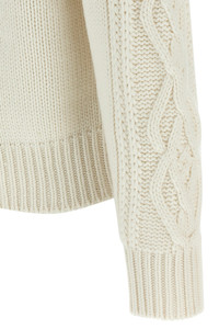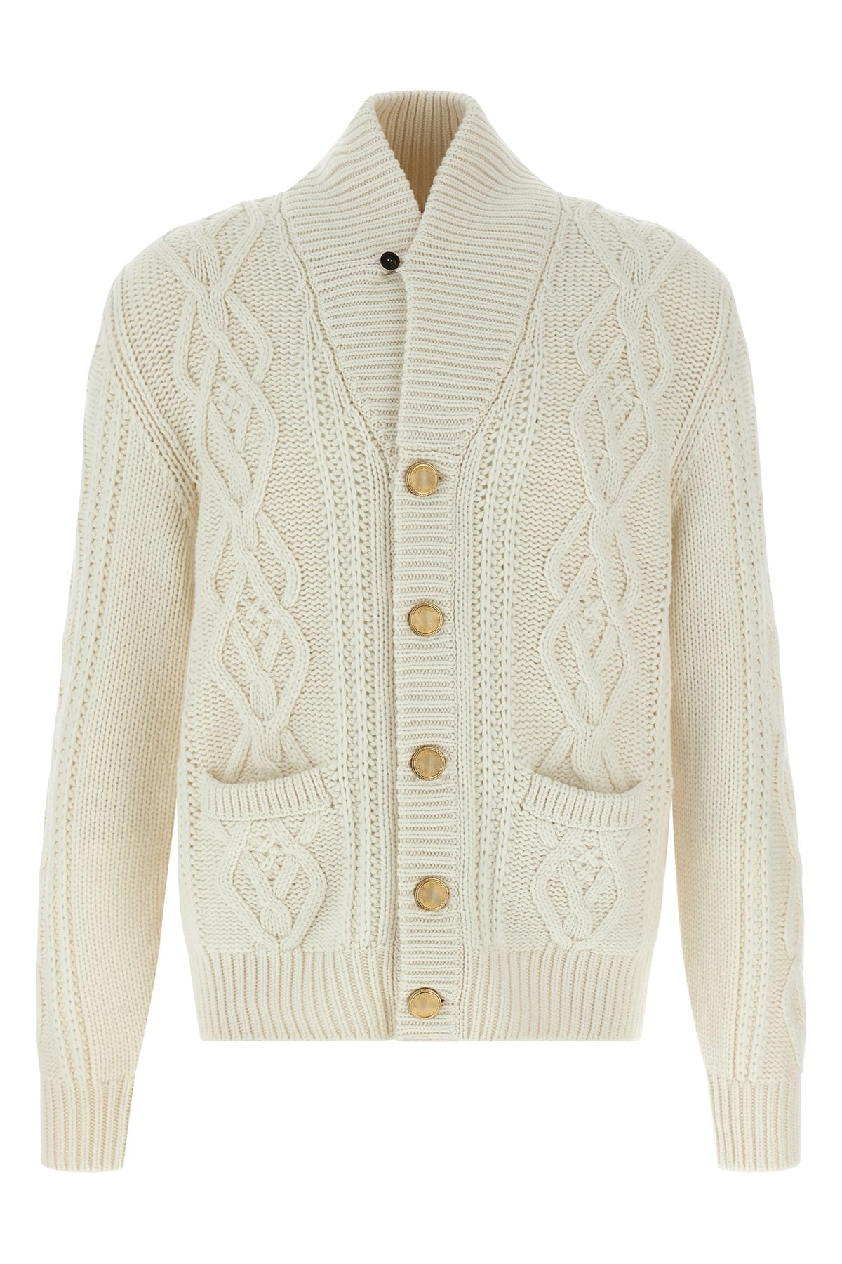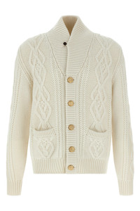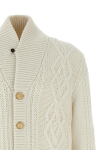 cod. MA2301006C2723 Cashmere knit cardigan with cable pattern, round neck with lapels and button, front closure with gold and logo buttons, long sleeves with cuffs. Color: White Size & Fit: True to size fit Composition: 100% cashmere Made in: Italy