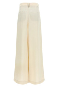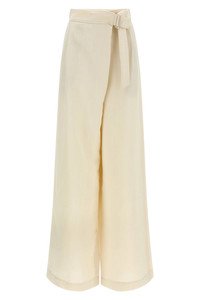 cod. MH126P9207C579 Palazzo pants in linen blend, wide leg with pleats at the waist, crossed closure with button and metal buckle, side pockets. Color: White Size & Fit: True to size fit Composition: 72% viscose, 28% linen Made in: Italy