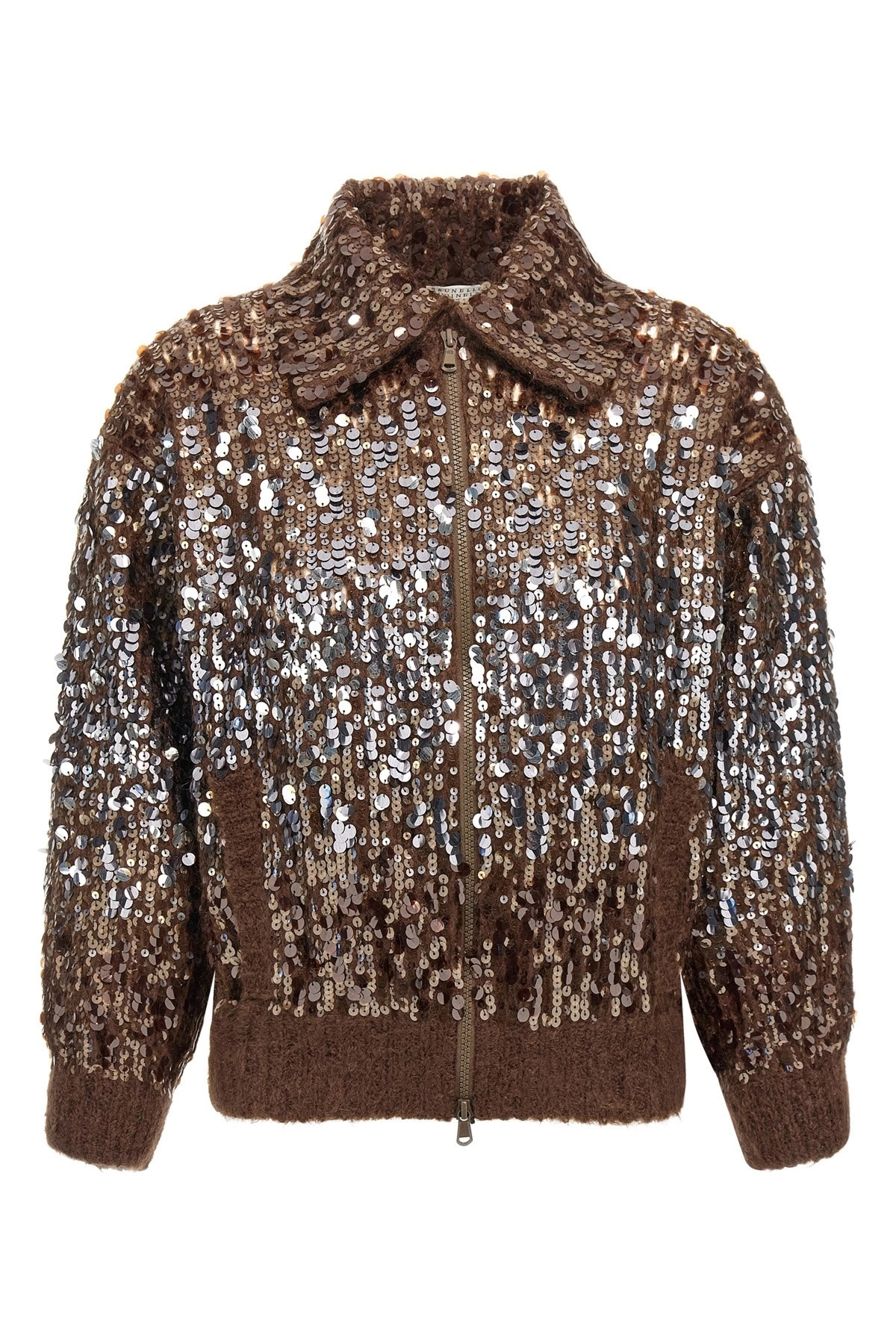 cod. M1U375916PC9149 Dazzling Degrade Embroidery' mohair and wool mesh knit cardigan with all-over sequin applique, shirt collar, front zip closure, pockets, long cuffed sleeves and dropped shoulders. Color: Brown Size & Fit: Comfort fit Composition: 81% mohair wool 11% polyamide 8% wool Made in: Italy