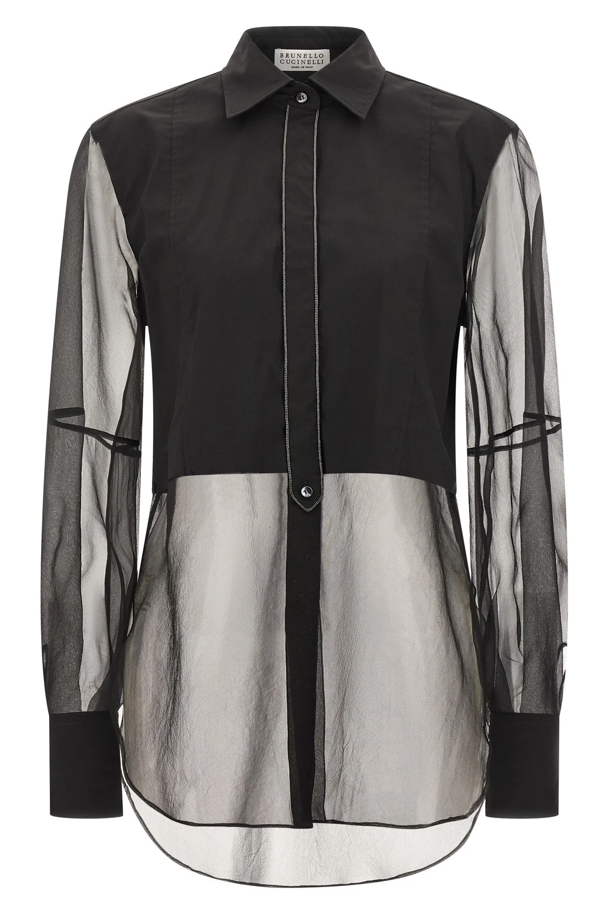 cod. MP091MQ406C101 Double layer shirt consisting of cotton poplin top and semi-transparent organza sleeves and sleeves, Monile detail and front button closure, long cuffed sleeves. Color: Black Size & Fit: true to size fit Composition: 72% cotton 23% polyamide 5% elastane Made in: Italy