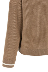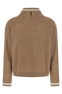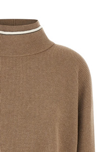 cod. M16222704CFE05 English rib wool, cashmere and silk blend sweater with contrast details, double layer high neck with Monile detail, long sleeves with double layer cuffs and dropped shoulders. Color: Brown Size & Fit: oversized fit Composition: 60% wv, 30% ws, 10% se Made in: Italy