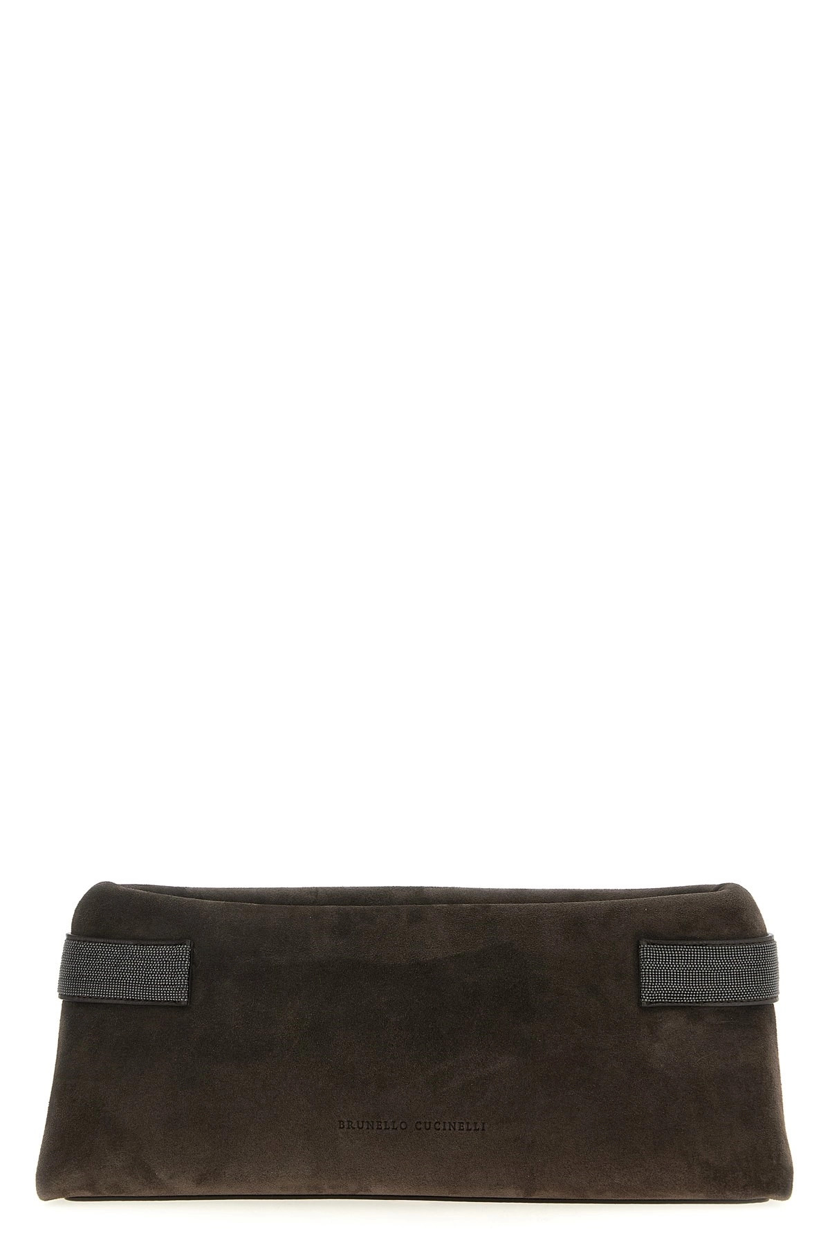 cod. MBDLD2746C7284 Suede Essence pouch with Monile Precious Bands side inserts, magnetic closure and leather lining. Color: Brown Size & Fit: W 34.5 x H 13.5 x D 7 cm Composition: 100% calfskin leather (Bos Taurus) Made in: Italy