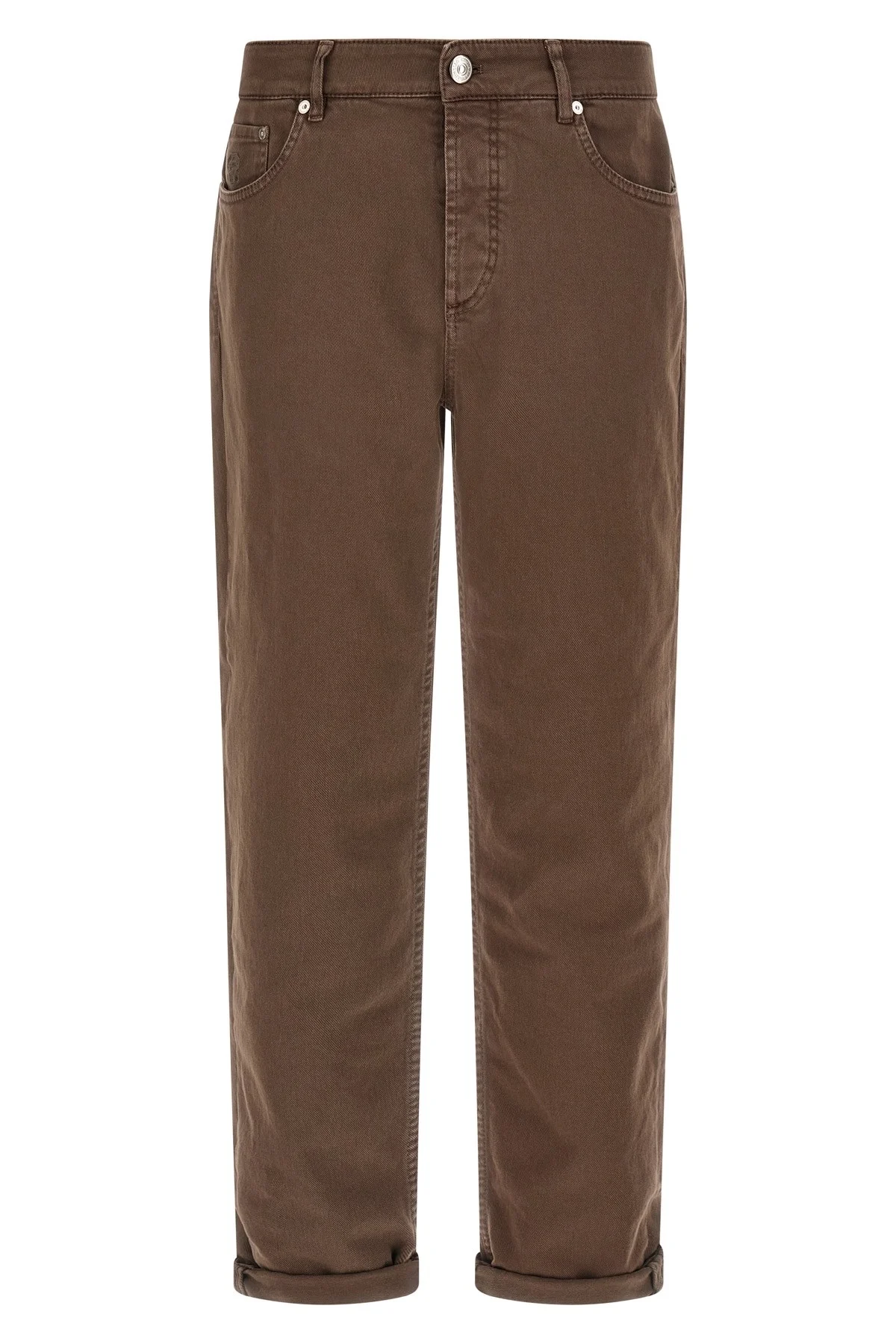 cod. M277PD3210C7503 Light denim jeans in garment-dyed comfort, tone-on-tone embroidered logo, front button closure, five pockets, and straight leg. Color: Brown Size & Fit: traditional fit Composition: 99% cotton, 1% elastane Made in: Italy