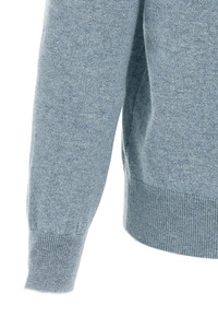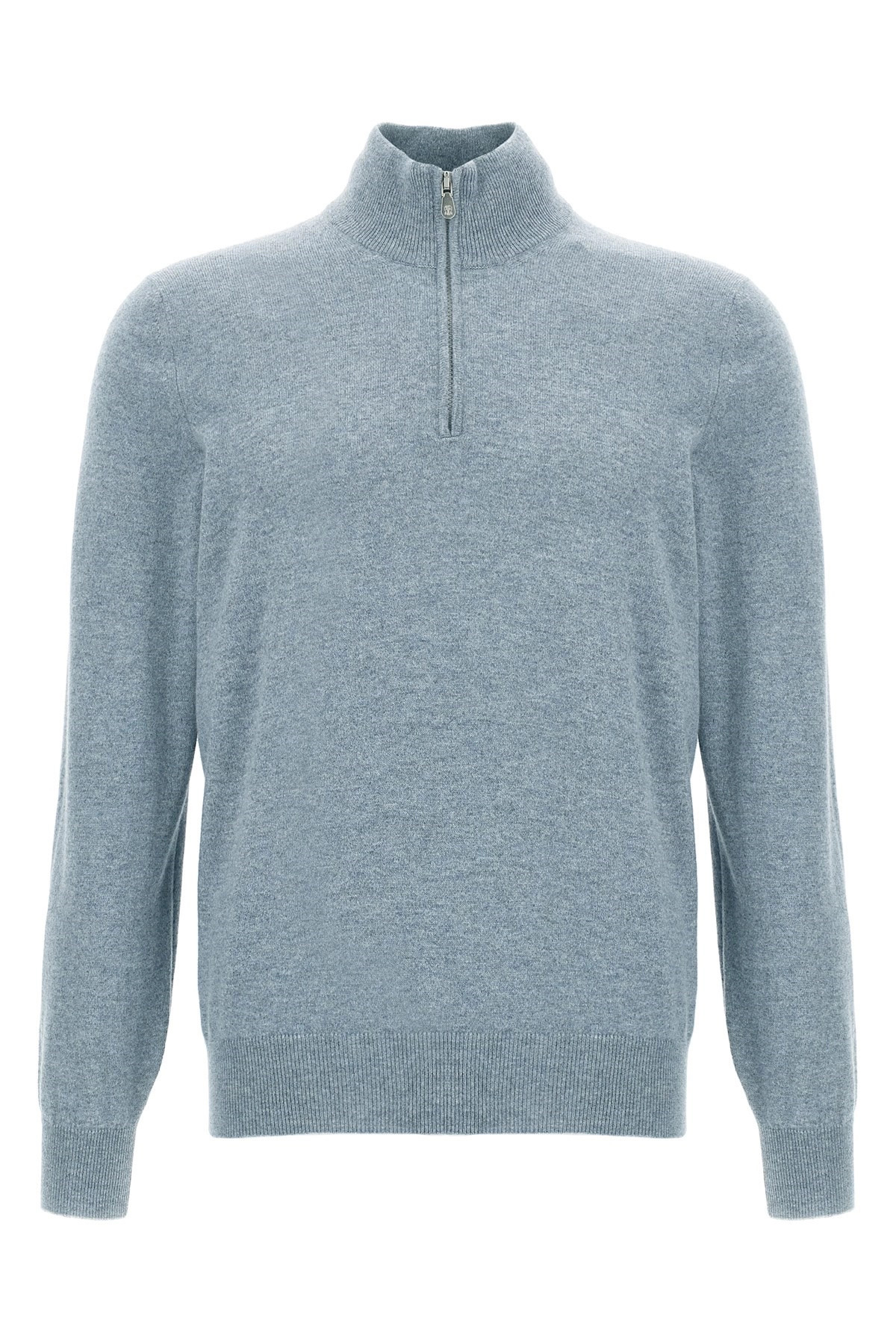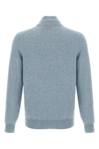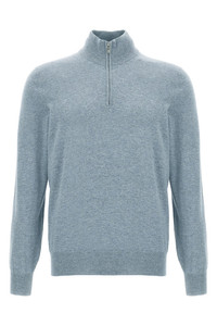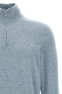 cod. M2200124CFF33 Cashmere sweater with contrast details, high neck, front half-zip, long cuffed sleeves. Color: Light Blue Size & Fit: true to size fit Composition: 100% cashmere Made in: Italy