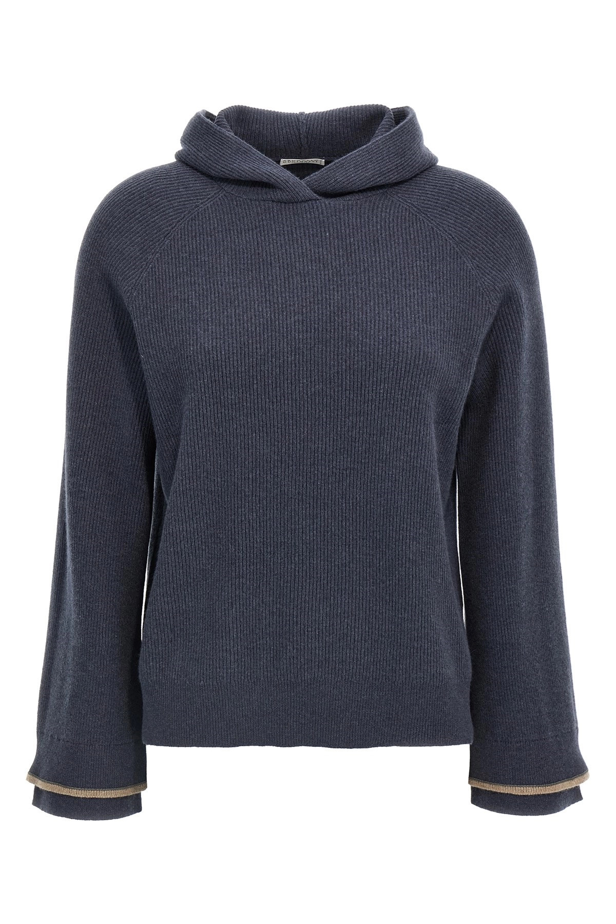 cod. M16222709CEP19 Ribbed wool, cashmere and silk blend sweater, hood, long flared sleeves with double cuffs and contrast detail and Monile. Color: Blue Size & Fit: Comfort fit Composition: 60% wv, 30% ws, 10% se Made in: Italy