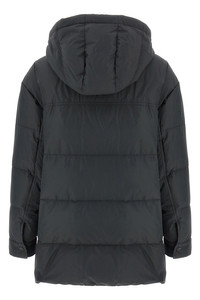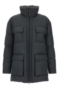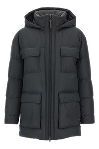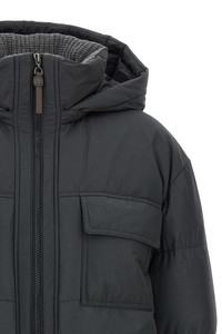 cod. MG5017784C2126 Quilted padded tech fabric down jacket, removable hood, high neck with crochet knit insert, front zip and snap button closure, pockets, long cuffed sleeves, side slits with zip closure. Color: Gray Size & Fit: true do size fit Composition: 55% polyester, 45% cotton Made in: Italy