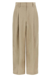 cod. MH527P9185C9272 Linen trousers, pince, wide leg, ironed pleat, zip hook and front button closure, pockets, back Monile detail. Color: Beige Size & Fit: true to size fit Composition: 100% linen Made in: Italy