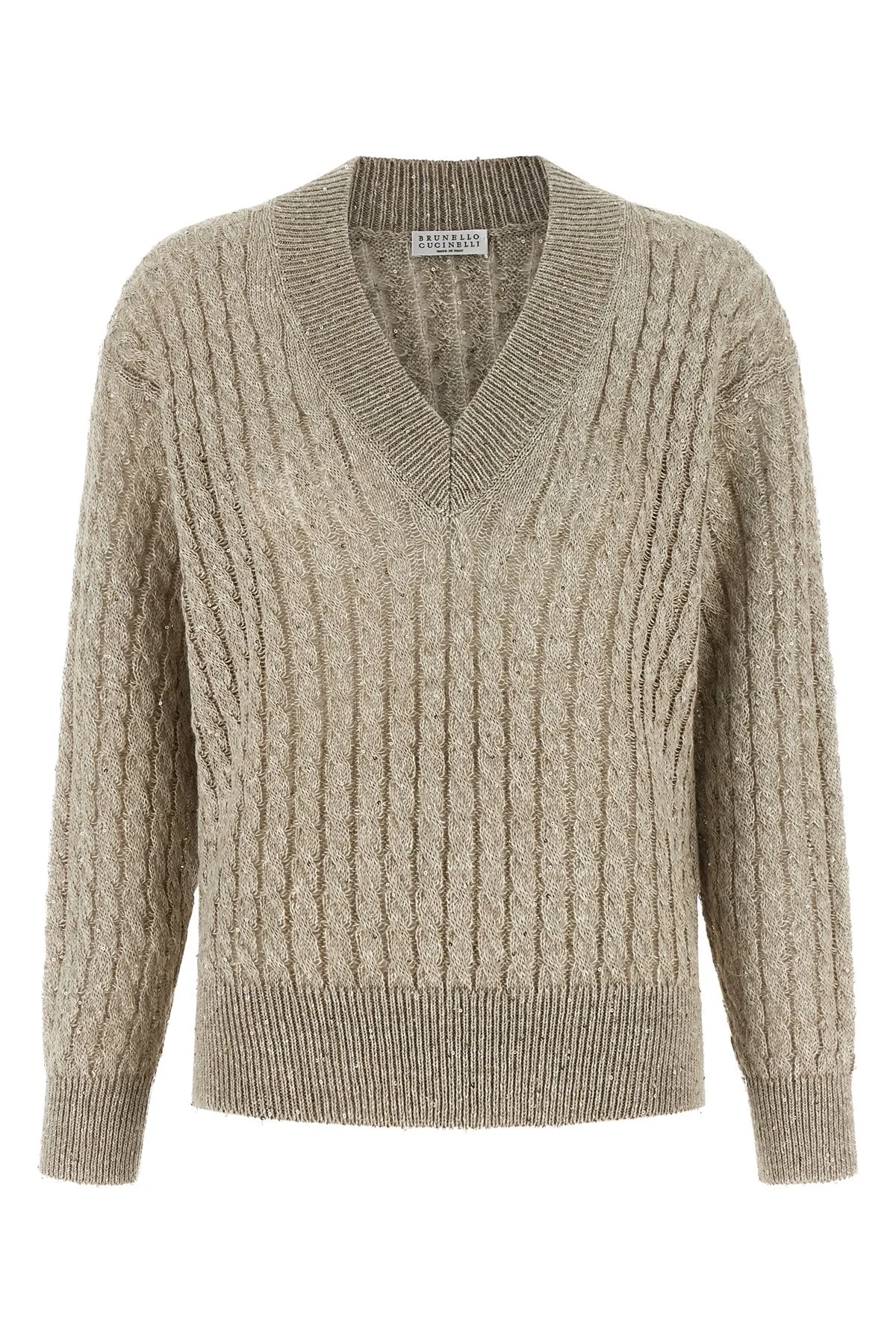 cod. MCO559702C1600 Knitted knitted linen sweater with all-over micro sequin applique, V-neck, long sleeves with cuffs and dropped shoulder, and band on the hem. Color: Beige Size & Fit: Comfort fit Composition: 94% linen 6% nylon Made in: Italy