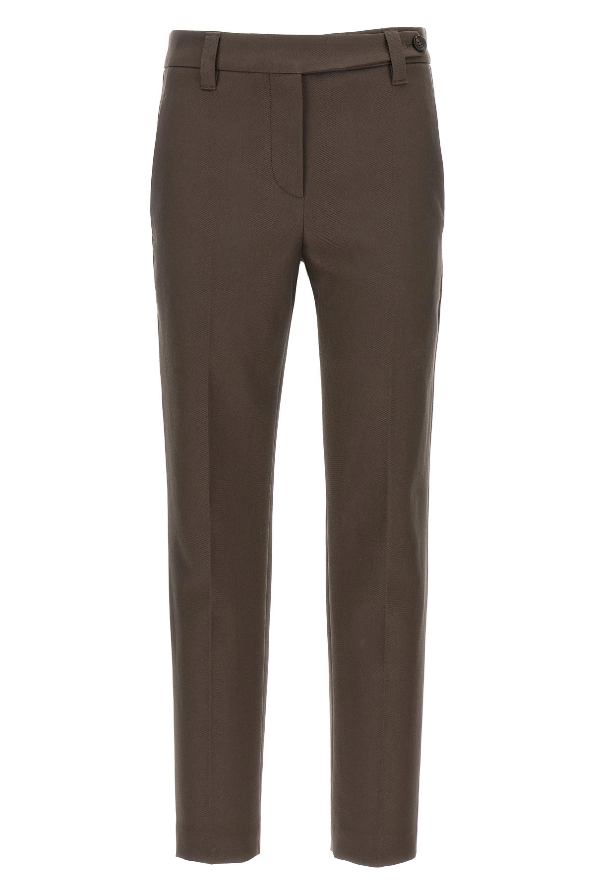 cod. MP126P8703C4222 Cotton pants, crop model, stretched pleat, zip hook and button closure on the front, pockets, straight leg, back Monile detail. Color: Brown Size & Fit: true to size fit Composition: 97% cotton, 3% elastane Made in: Italy