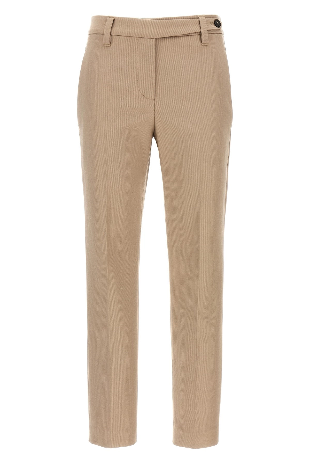 cod. MP126P8703C8950 Cotton pants, crop model, stretched pleat, zip hook and button closure on the front, pockets, straight leg, back Monile detail. Color: Beige Size & Fit: true to size fit Composition: 97% cotton, 3% elastane Made in: Italy