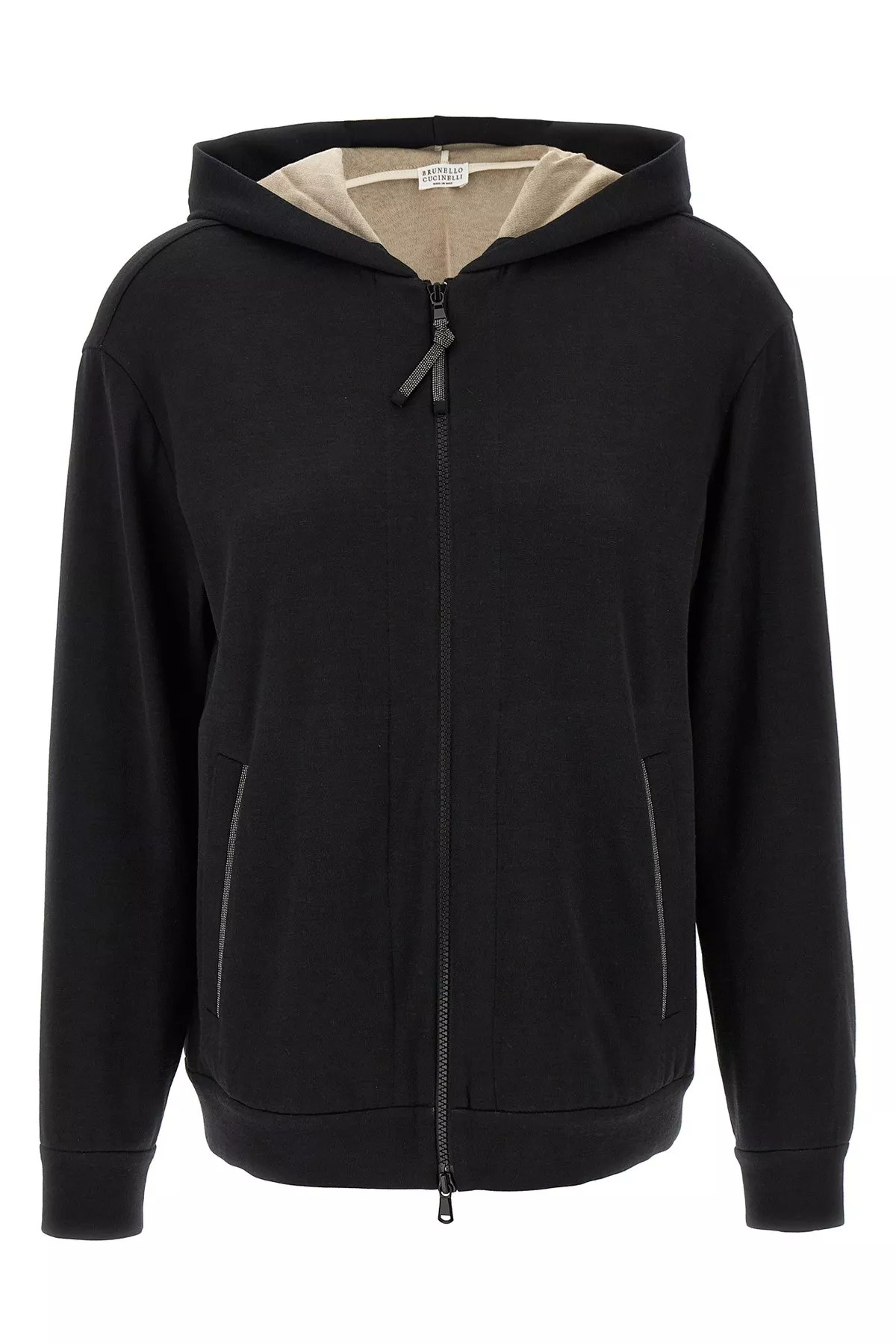 cod. MP828SB806C9185 Cotton blend hoodie with zip closure, pockets with 'Monile' detail, long cuffed sleeves. Color: Black Size & Fit: true to size fit Composition: 67% cotton 31% silk 2% polyamide