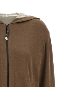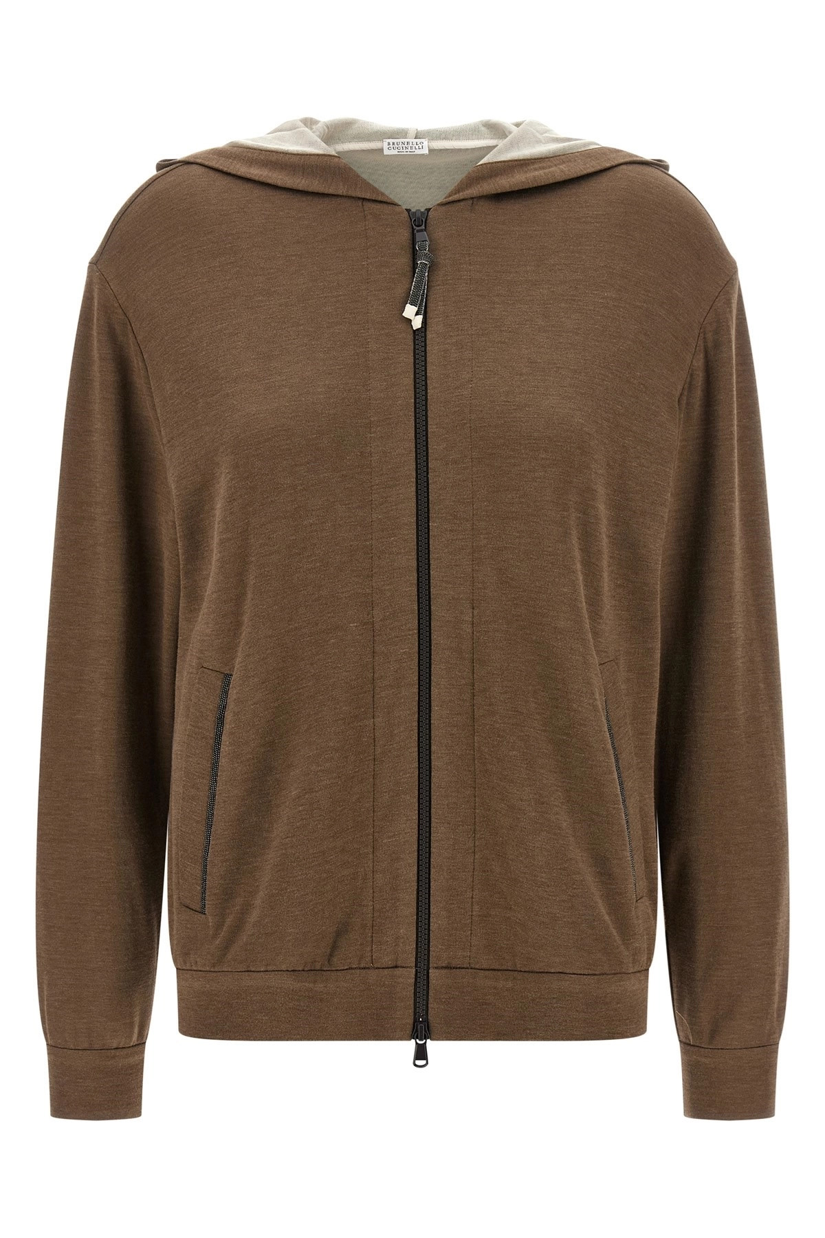 cod. MD828SB806C9122 Cotton and silk blend melange hoodie, pockets with Monile detail, front zip closure with Monile zip puller, long cuffed sleeves. Color: Brown Size & Fit: true to size fit Composition: 67% cotton 31% silk 2% polyamide Made in: Italy