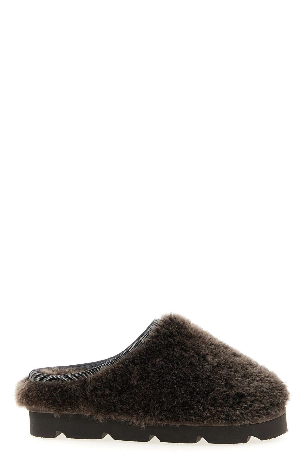 cod. MZVBG3083C2390 Sherling sabots with Monile detail and rubber sole. Color: Brown Size & Fit: EU WOMEN Composition: 100% lamb leather (Ovis aries) Made in: Italy
