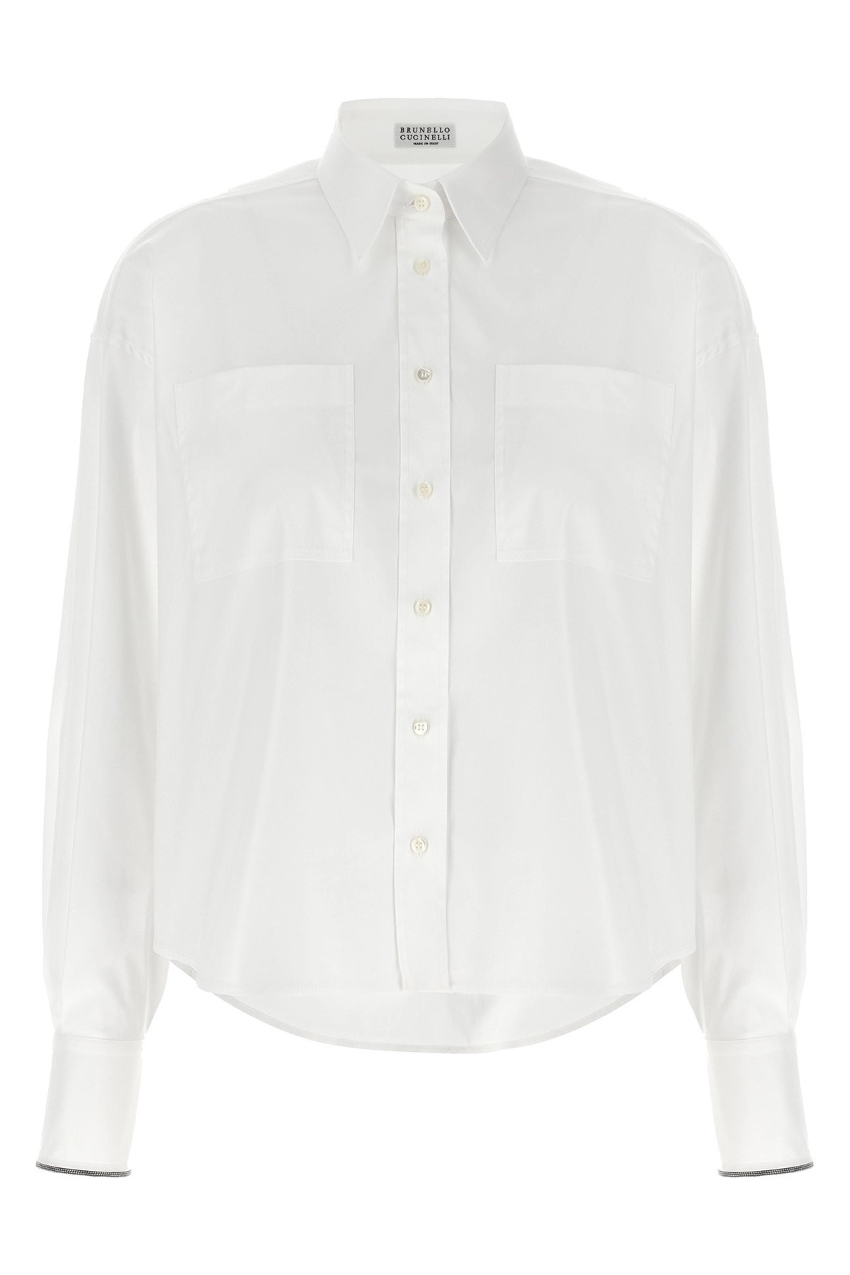 cod. M0091NL496C159 Stretch cotton poplin shirt with button closure, pockets, long sleeves with Monile detail cuffs, and wide hem. Color: White Size & Fit: true to size fit Composition: 72% cotton 23% polyamide 5% elastane Made in: Italy