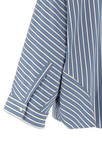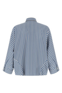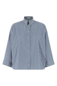 cod. MH749MX716C001 Striped cotton poplin shirt, slightly cropped model, pointed collar with Monile detail on the back, front button closure, 3/4 bat sleeves with cuffs. Color: Light Blue Size & Fit: oversized fit Composition: 100% cotton Made in: Italy