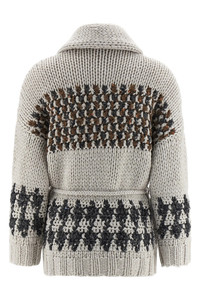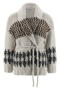 cod. M52638506C9610 Piuma 'OPERA Prince of Wales' cashmere cardigan with jacquard alpaca and cotton yarns with the addition of sequins, made entirely by hand, robe style, shawl collar, pockets, long sleeves with cuffs and dropped shoulder, removable belt. Color: Multicolor Size & Fit: true to size fit Composition: 100% cashmere Made in: Italy