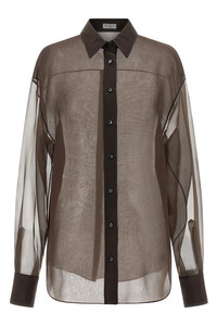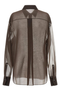 cod. MF940NB916C4222 Transparent silk organza shirt with double layer, collar and front button closure, long sleeves with cuffs. Color: Brown Size & Fit: True to size fit Composition: 100% silk Made in: Italy