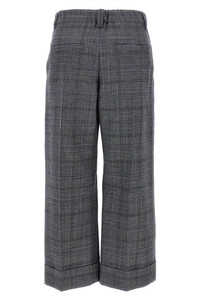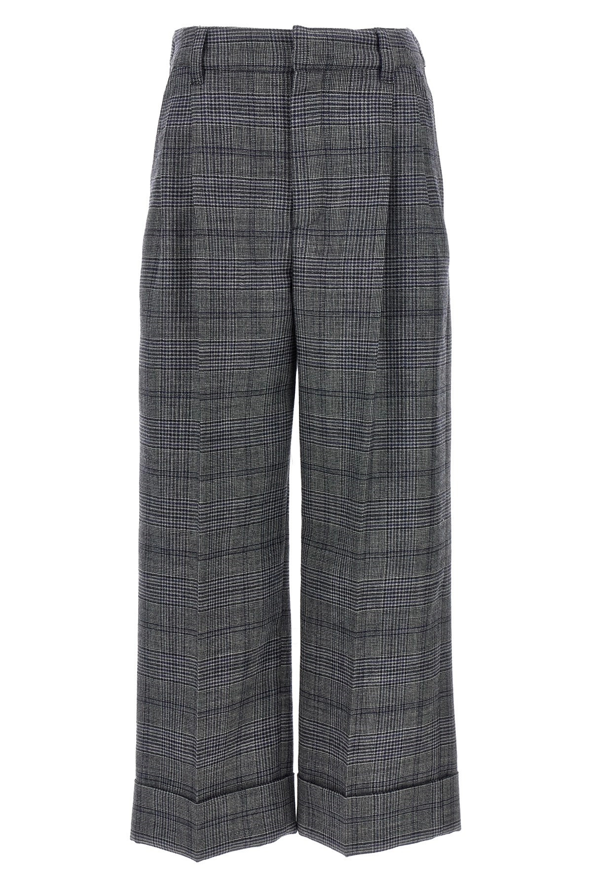 cod. MP522P9017C4227 Houndstooth patterned wool trousers, pleats, stretched pleat, wide leg, zip hook and front button closure, elastic waistband, pockets, turn-up on the leg bottom, back Monile detail. Color: Gray Size & Fit: true to size fit Composition: 100% virgin wool Made in: Italy