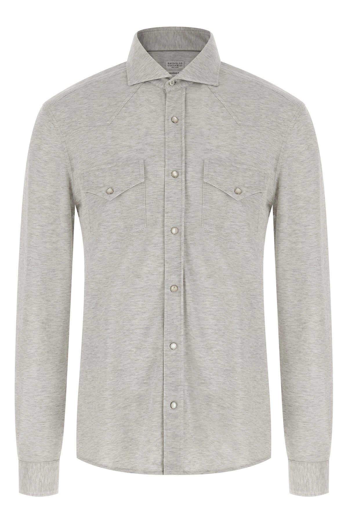 cod. ME8546666C3657 Cotton pique shirt with front snap button closure, pockets, long cuffed sleeves. Color: Gray Size & Fit: leisure fit Composition: 100% cotton Made in: Italy