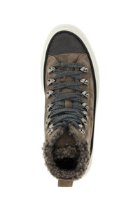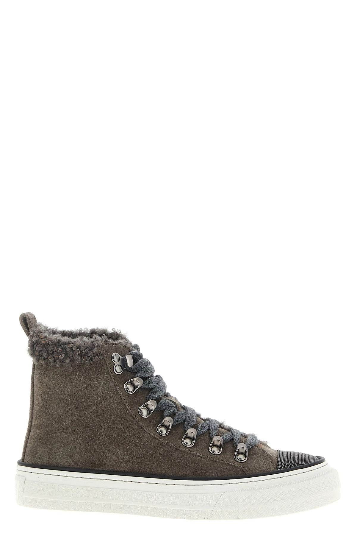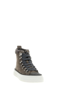 cod. MZSFG3095C8212 Suede sneakers with Monile 'Precious Toe' detail on the toe, shearling lining, laces closure, removable insole, rubber sole. Color: Gray Size & Fit: EU WOMEN Composition: 100% calfskin leather (Bos Taurus) Made in: Italy