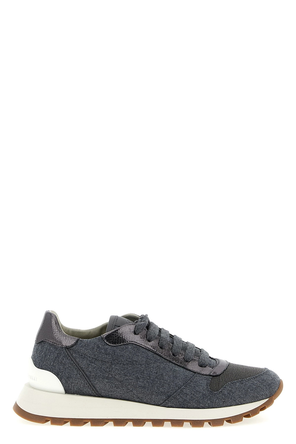 cod. MZ26G1960C003 'Runners Precious Toe' melange wool sneakers with laminated leather details and Monile toe, lace-up closure and rubber sole. Color: Gray Size & Fit: EU WOMEN Composition: 100% virgin wool Made in: Italy