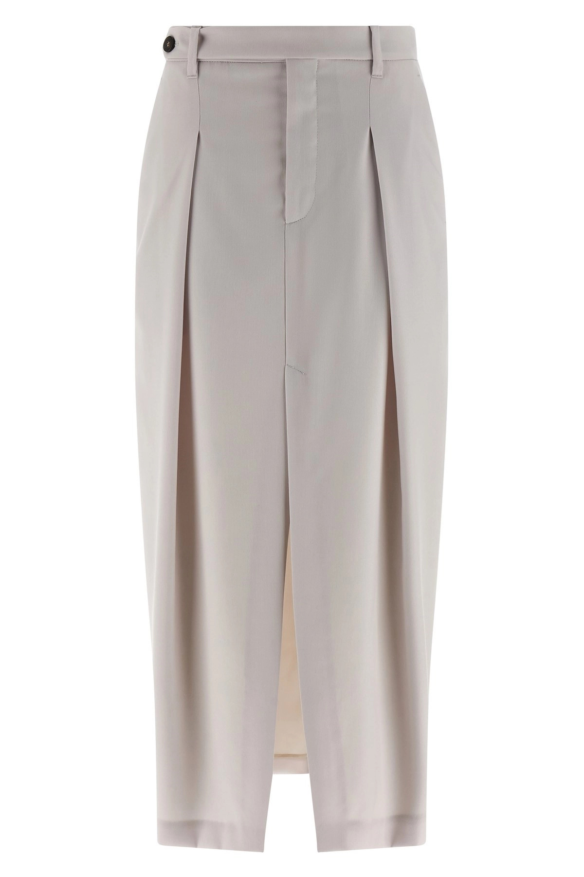 cod. MG513G3841C4239 'Sartorial Curved' midi skirt in virgin wool and mohair twill, front and back gusset pins, hook and button zip closure and front split, pockets, back Monile detail, lining. Color: White Size & Fit: true to size fit Composition: 70% virgin wool 30% mohair Made in: Italy