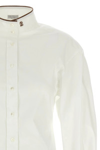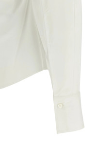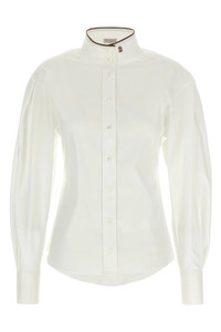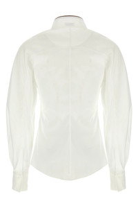 cod. M0091NL936C159 Stretch cotton poplin shirt, high collar with jewel 'Shiny Collar Detail' and logo embroidery, front button closure, long balloon sleeves with cuffs. Color: White Size & Fit: true to size fit Composition: 72% cotton 23% polyamide 5% elastane Made in: Italy