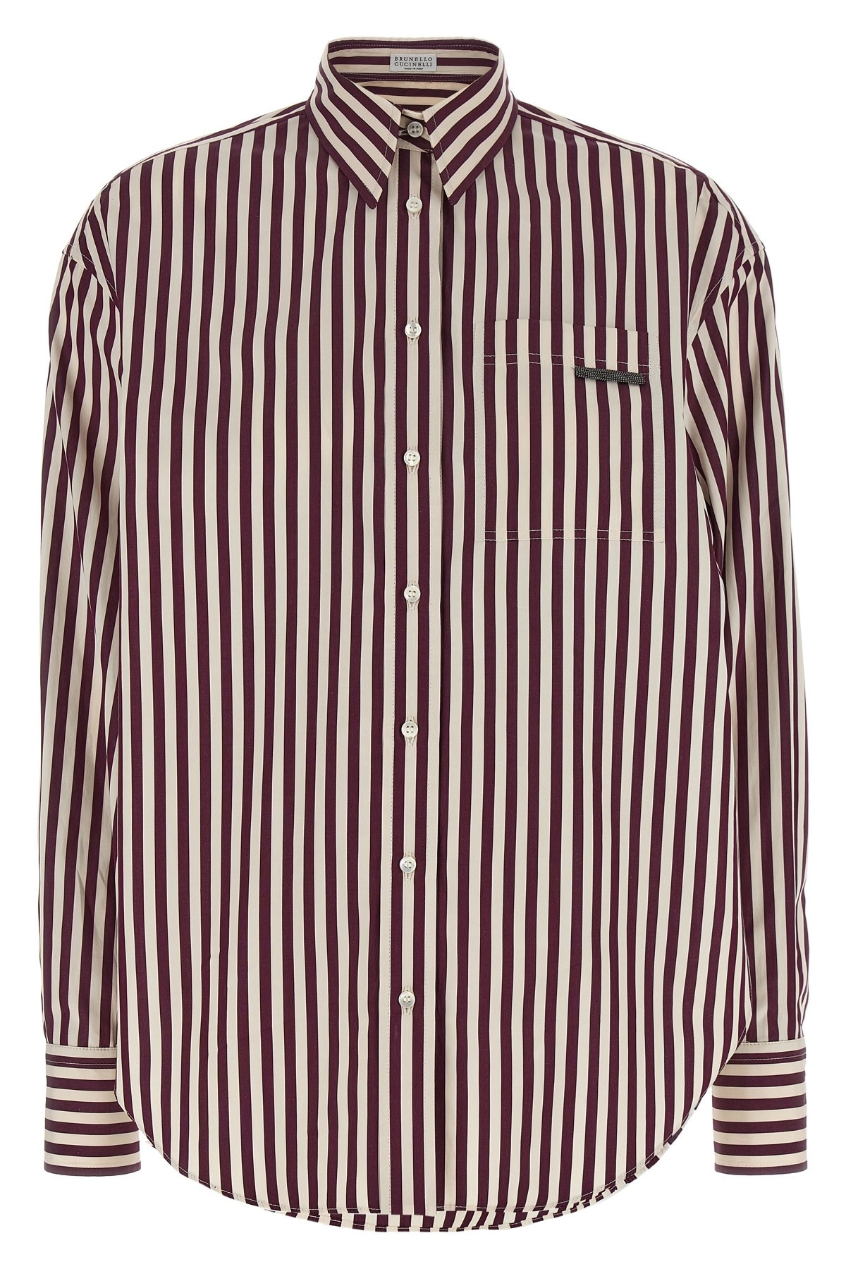 cod. MP601NB206C350 Striped cotton poplin shirt, breast pocket with Monile 'Shiny Detail', front button closure, long cuffed sleeves. Color: Bordeaux Size & Fit: true to size fit Composition: 100% cotton Made in: Italy