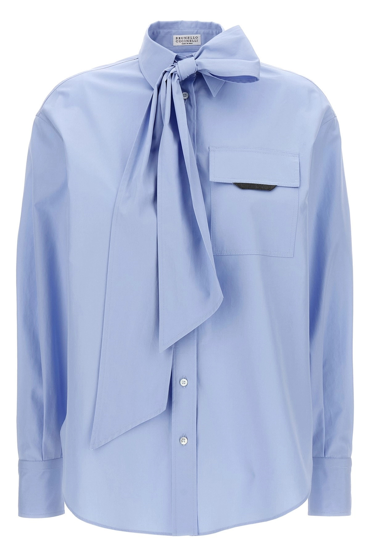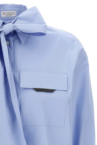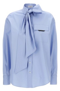 cod. MP772MY526C172 Cotton poplin shirt with removable lavalliere scarf, breast pocket with Monile 'Shiny Flap Detail', front button closure, long cuffed sleeves and dropped shoulders. Color: Light Blue Size & Fit: oversized fit Composition: 100% cotton Made in: Italy