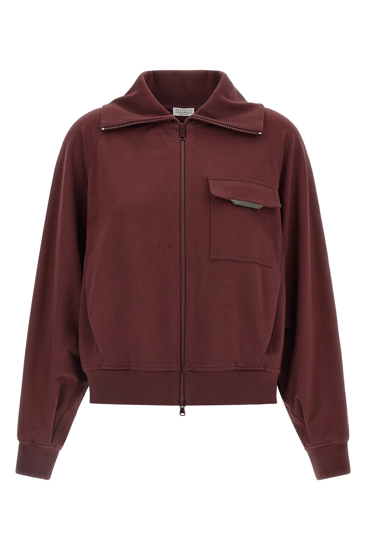 cod. MP827SN706C7235 Light stretch cotton sweatshirt, breast pocket with Monile 'Shiny Flap Detail', front zip closure, foldable high neck, pockets, long cuffed sleeves. Color: Bordeaux Size & Fit: Comfort fit Composition: 98% cotton, 2% elastane