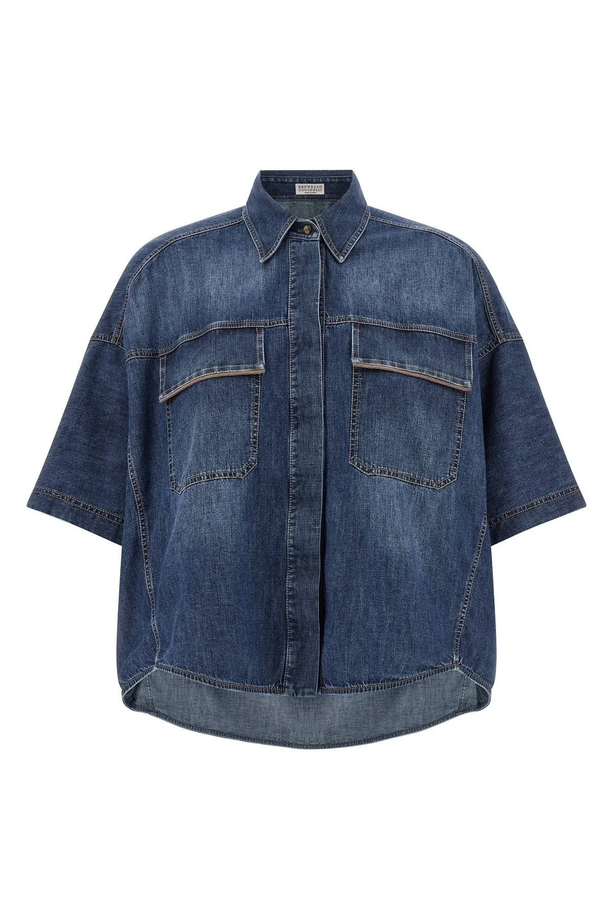 cod. MH192RB526C9031 Light denim shirt with contrast stitching, slightly cropped style, 'Shiny Pockets' pockets with Monile detail on the flap, concealed front button closure, short bat sleeves, side slits, and asymmetrical hem. Color: Blue Size & Fit: oversized fit Composition: 100% cotton Made in: Italy