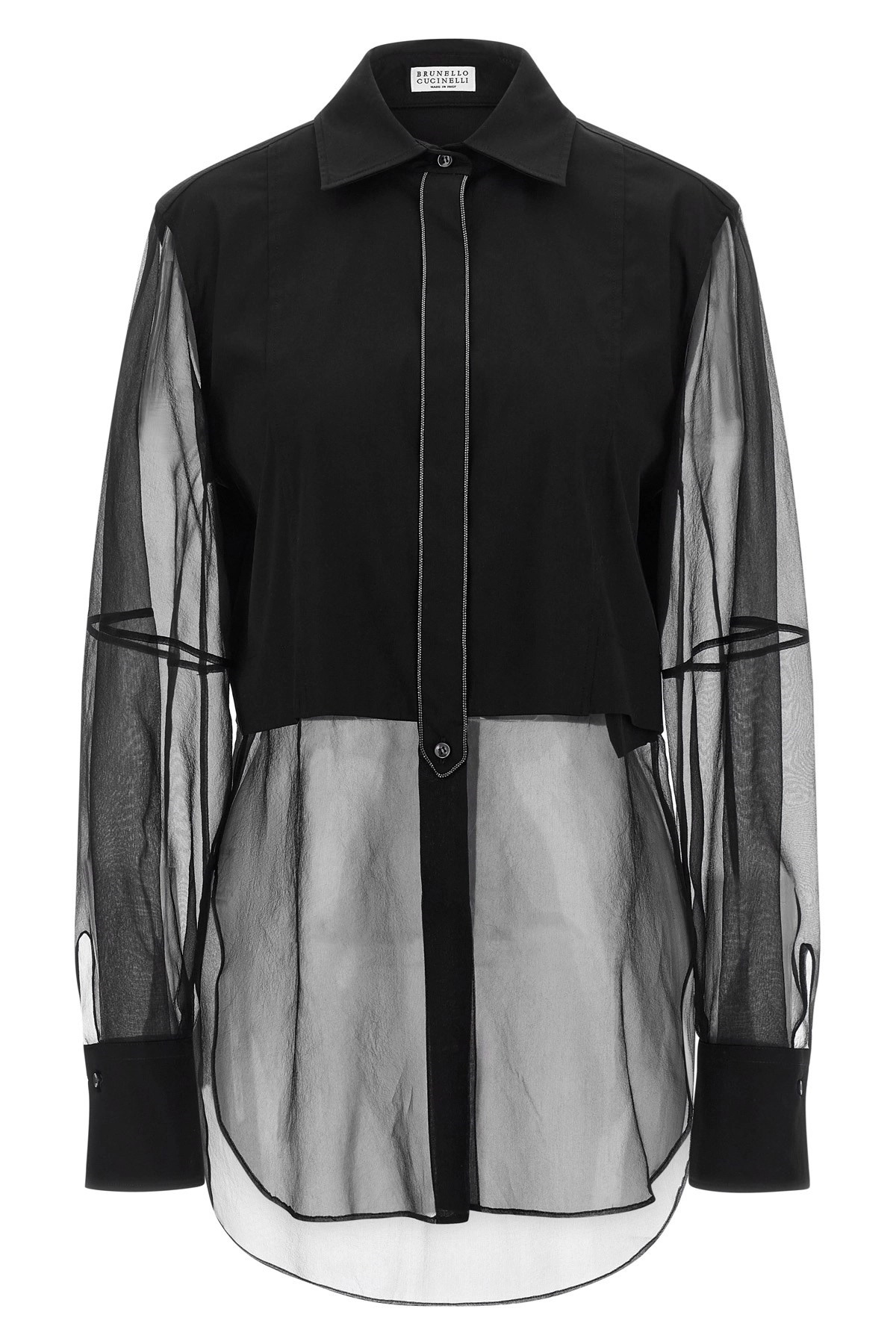 cod. M0091MQ406C101 Stretch cotton poplin and semi-transparent crispy silk shirt, concealed front button closure with Monile 'Shiny Trims' detail, long wide sleeves with cuffs. Color: Black Size & Fit: true to size fit Composition: 72% cotton 23% polyamide 5% elastane Made in: Italy