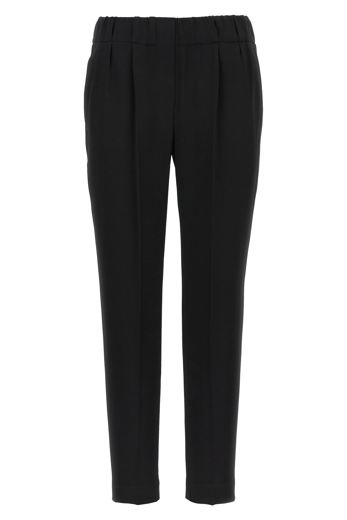 cod. MA029P1673C101 Silk blend trousers, elastic waistband, trompe l'oeil flap, straight leg, ironed pleat and pleat, pockets. Color: Black Size & Fit: true to size fit Composition: 52% acetate, 48% silk Made in: Italy