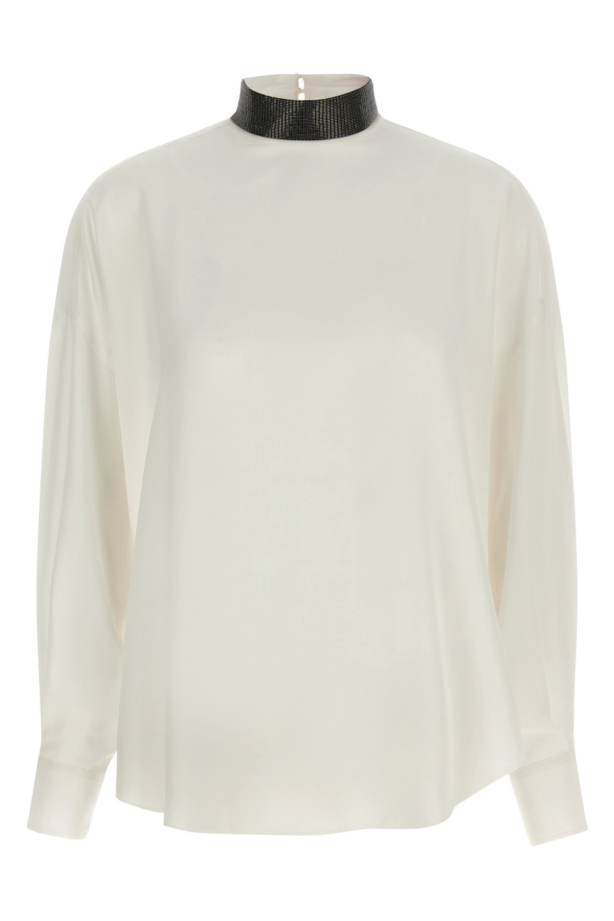 cod. MB993EK724C600 Silk blouse, high neck with removable 'Monile' accessory, back button closure, long sleeves with cuffs and button. Color: Beige Size & Fit: True to size fit Composition: 100% silk Made in: Italy