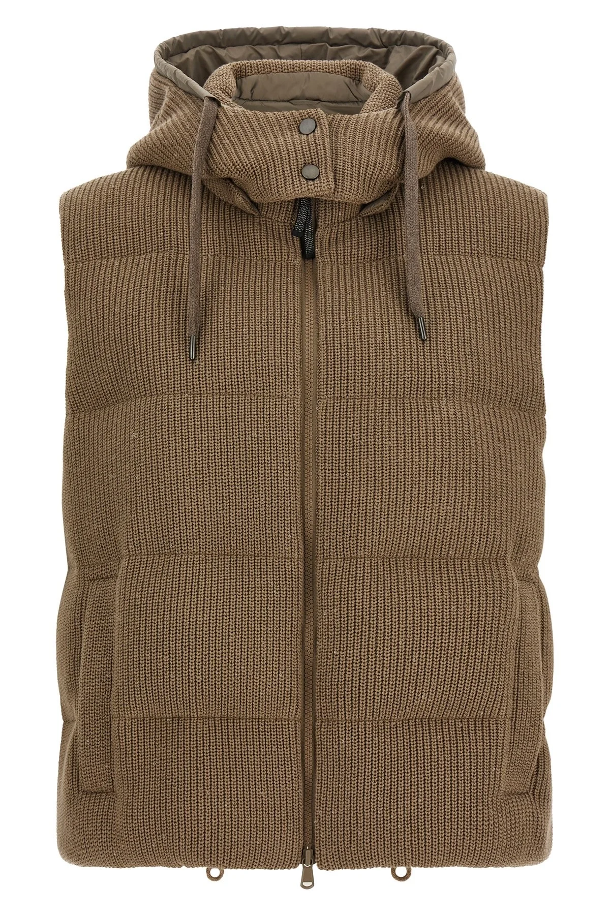 cod. M0DVT2142CVB14 Sleeveless 'Dazzling' cotton knit down jacket with microsequin insert, English rib processing, removable drawstring hood with snap buttons, goose down padding, water-repellent lightweight nylon lining, low pockets with snap buttonFront zip closure and double slider and puller rod with monile detail, elastic hem with adjustable drawstring Color: Brown Size & Fit: True to size fit Composition: 96% cotton, 4% polyester Made in: Italy