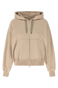 cod. MH827HZ506C9272 Lightweight stretch cotton hoodie with tone-on-tone 'Solomei AD MCCCXCI' print on the back, front zip closure, pockets, long sleeves with cuffs and dropped shoulders. Color: Beige Size & Fit: Comfort fit Composition: 98% cotton, 2% elastane Made in: Italy