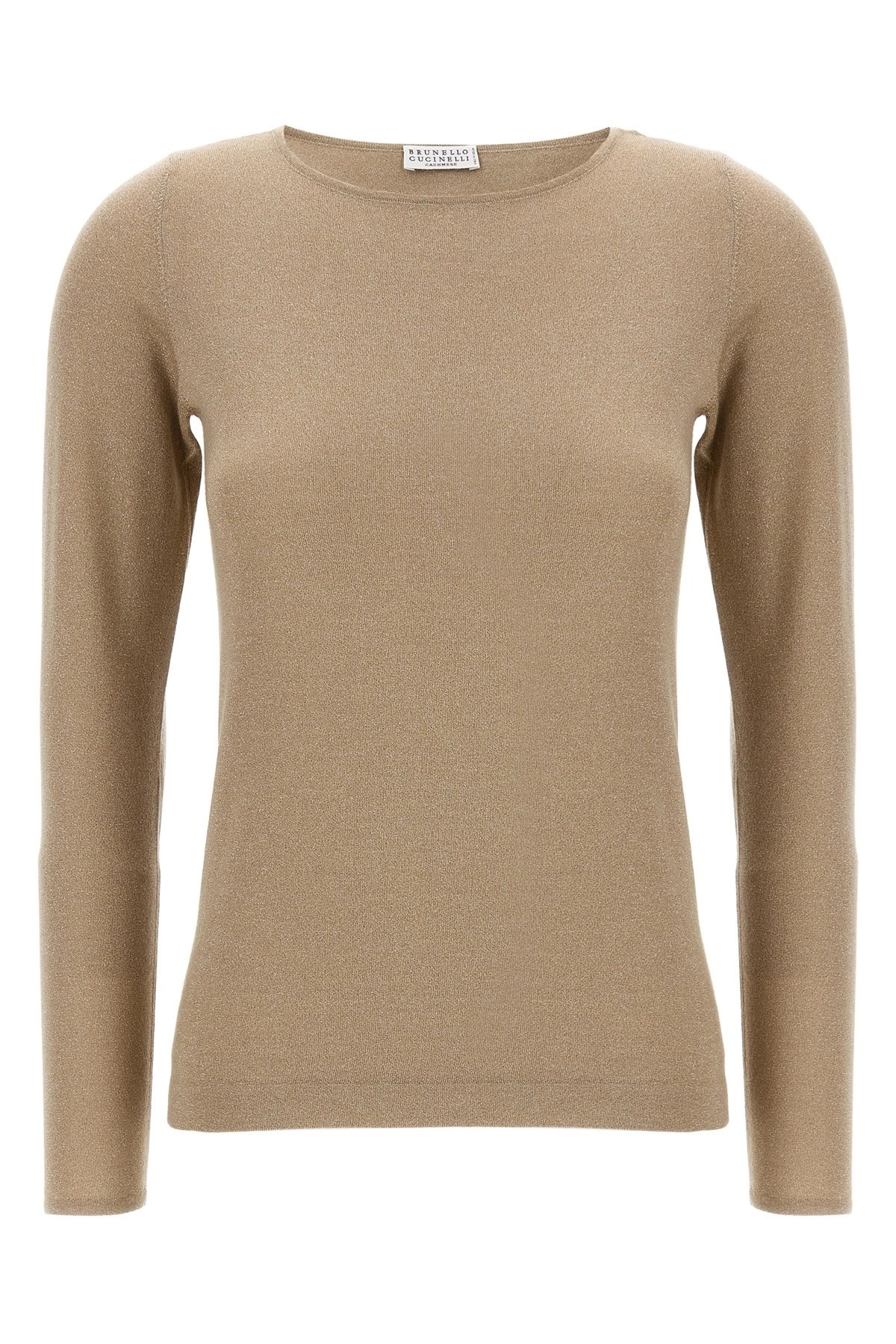 cod. M41800008PC077 'Sparkling' cashmere and silk blend sweater with lame thread, round neckline and long sleeves. Color: Gold Size & Fit: true to size fit Composition: 51% ws 22% se 20% pa 7% pm Made in: Italy