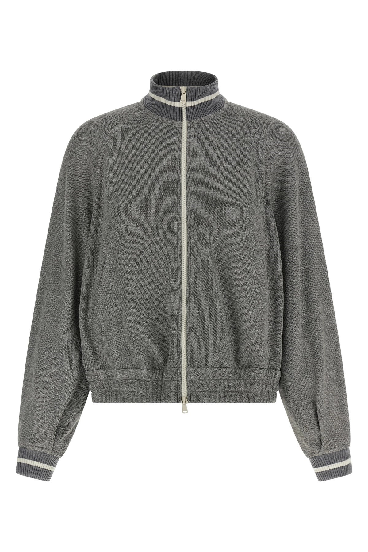 cod. MP930SN806C4527 Cotton and viscose 'Sparkling' pique sweatshirt with lame thread and stretch ribbed knit details, cropped bomber jacket styles, high neck, front zip closure, pockets, long sleeves with cuffs and dropped shoulders. Color: Silver Size & Fit: Comfort fit Composition: 62% viscose 33% cotton 5% polyester Made in: Italy