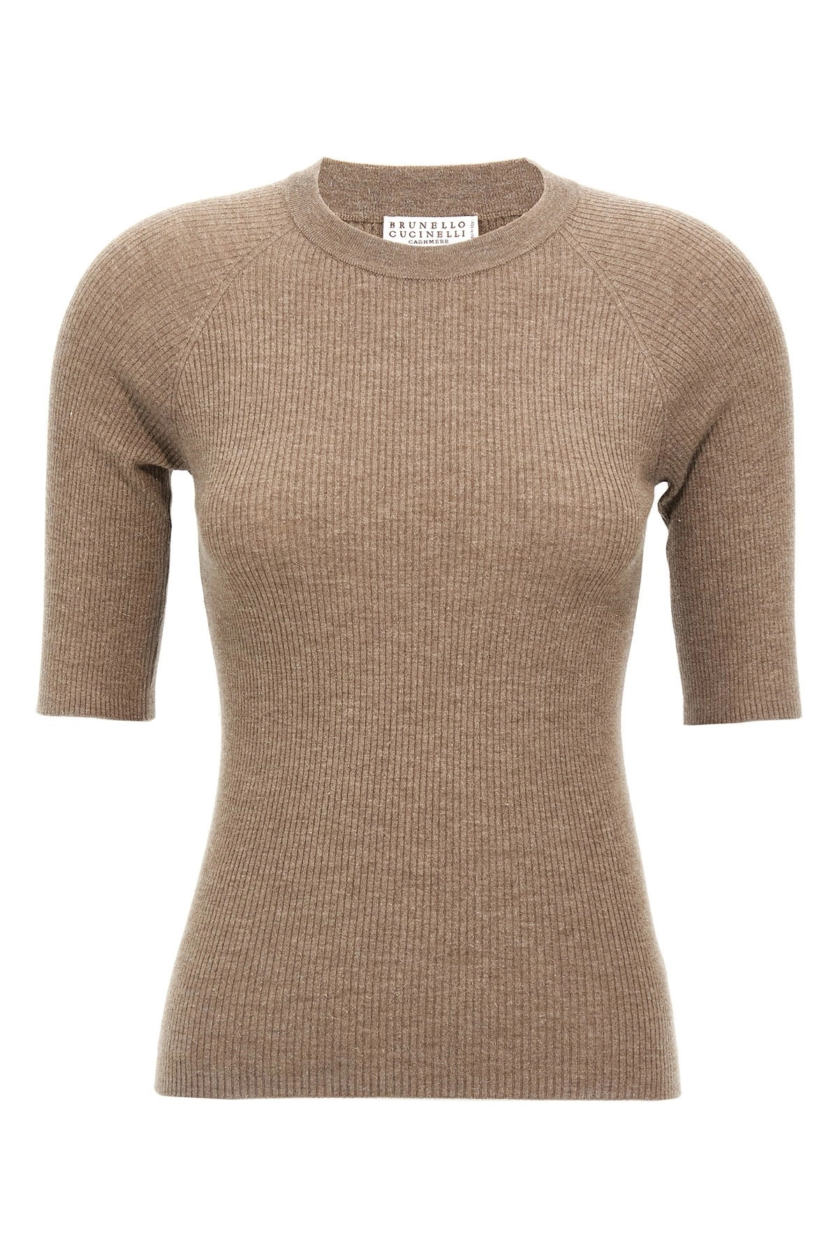 cod. M9A822200C4179 'Sparkling' lightweight ribbed cashmere knit t-shirt with lame thread, round neckline, and short sleeves. Color: Brown Size & Fit: true to size fit Composition: 46% ws, 41% vi, 13% pl Made in: Italy