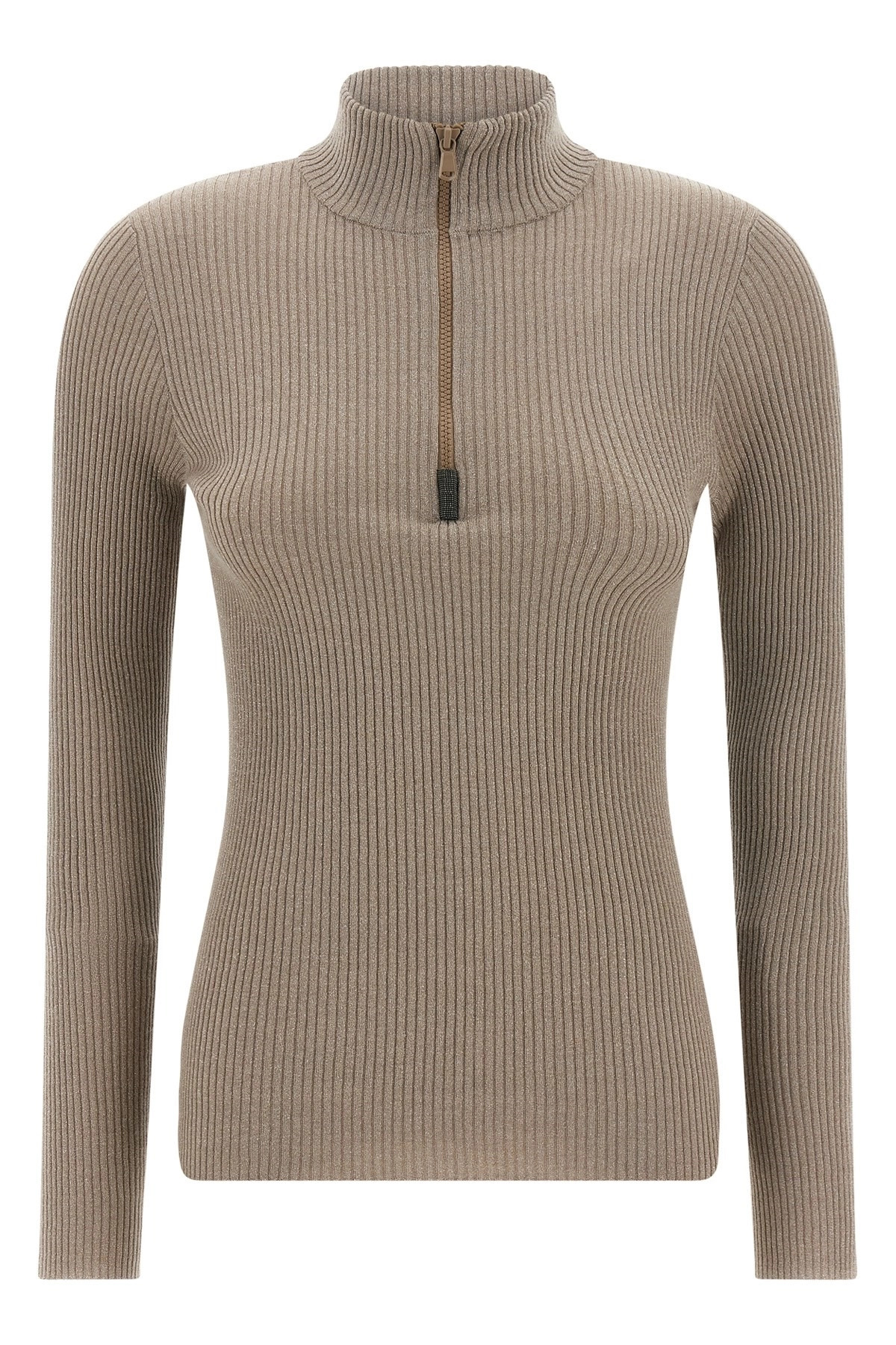Sparkling cashmere and silk rib knit lightweight sweater with half zip and shiny detail