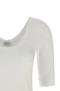 cod. MPTC8FX220C159 Stretch cotton ribbed jersey T-shirt with wide round neckline on the front and back, back Monile detail, and short sleeves. Color: White Size & Fit: true to size fit Composition: 94% cotton 6% elastane Made in: Italy